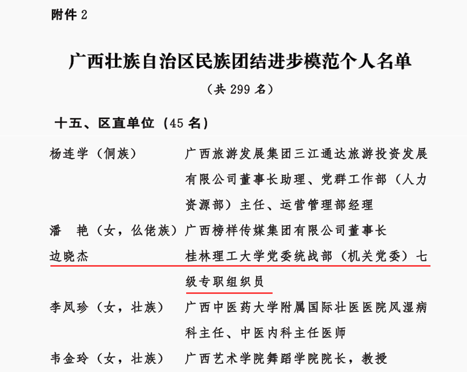 近日,自治区党委、自治区人民政府公布《太阳集团2138表彰广西壮族自治区民族团结进步模范集体和模范个人的决定》,授予299名个人“广西壮族自治区民族团结进步模范个人”称号,太阳集团2138机关党委七级专职组织员边晓杰名列其中。