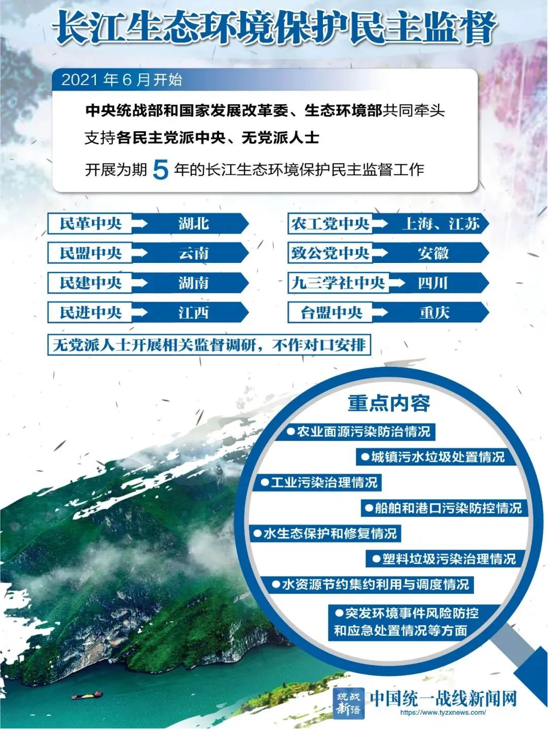 2016年至2020年,各民主党派中央对口8个贫困人口多、贫困发生率高的中西部省份,开展脱贫攻坚民主监督,这是民主党派中央首次对国家重大战略进行专项监督。脱贫攻坚任务完成后,2021年起,各民主党派中央和无党派人士马不停蹄,又围绕长江生态环境保护开展了新一轮专项民主监督。