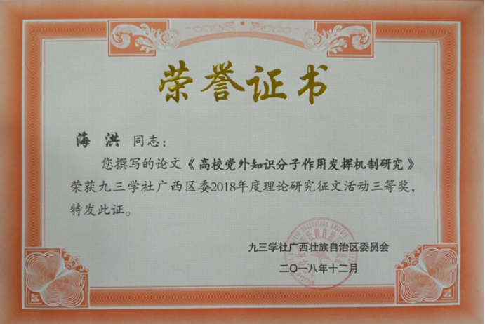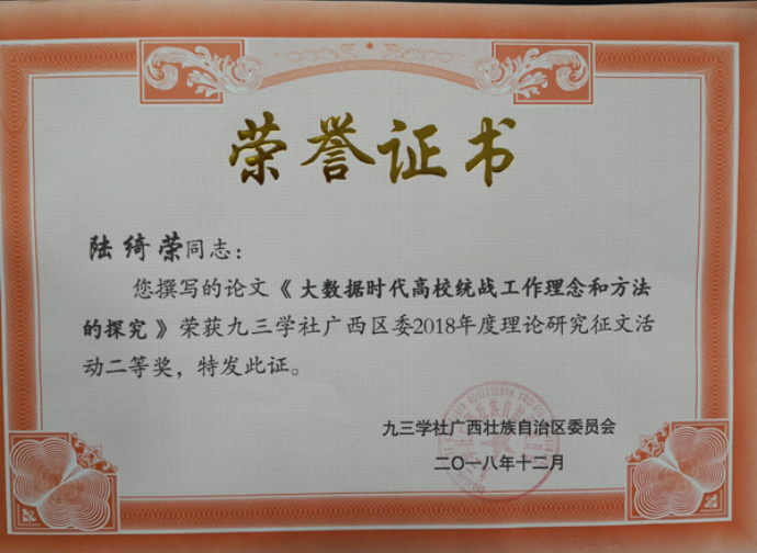 新年伊始,九三学社广西区委、九三学社桂林市委分别对2018年度理论研究征文活动和2018年提案宣讲评比活动中的获奖个人、集体进行了表彰,太阳集团2138九三支社社员精心准备、积极参与。其中陆绮荣老师撰写的论文《大数据时代高校统战工作理念和方法的探究》荣获九三学社广西区委2018年度理论研究征文活动二等奖,海洪老师撰写的论文《高校党外知识分子作用发挥机制研究》荣获九三学社广西区委2018年度理论研究征文活动三等奖;学校九三支社在社市委2018年度基层组织目标管理项目评比中荣获二等奖,支社提交的《加大政策资金扶持力度,支持我市民营高科技企业发展》提案,荣获社市委2018年提案宣讲和评比三等奖。